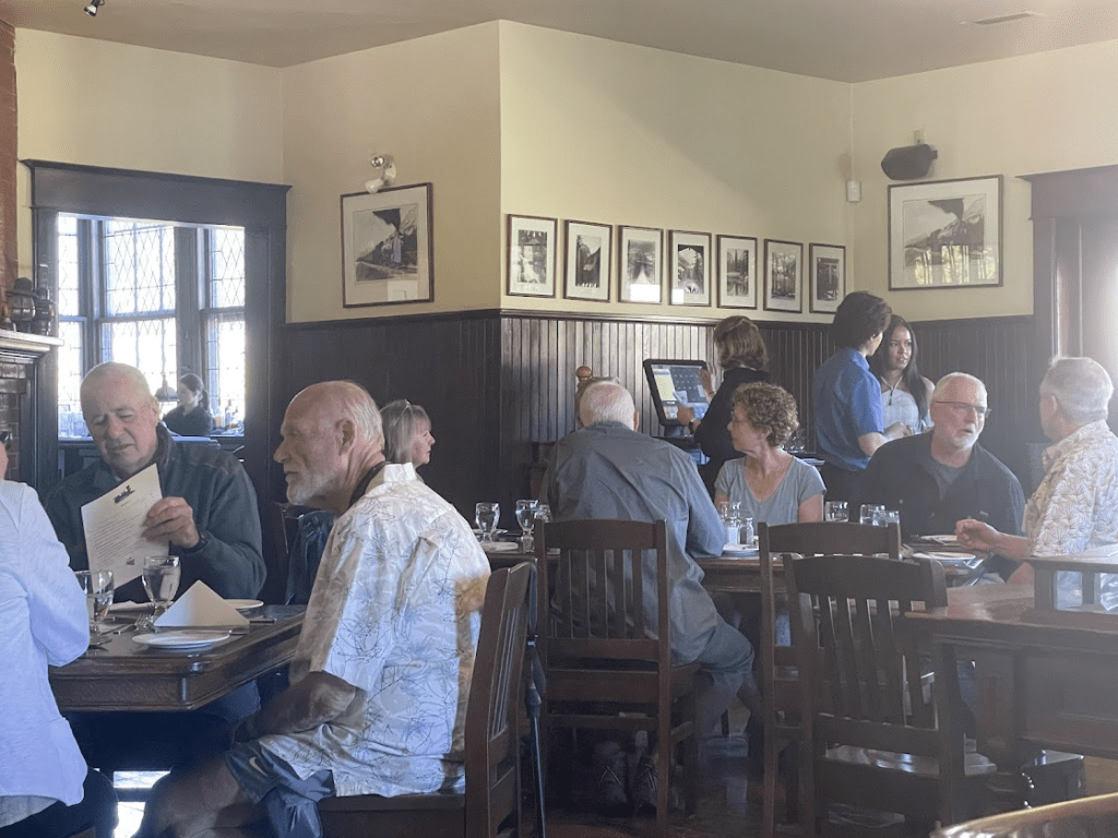 Jim and I took a drive into the country, then we stopped for lunch in this restored Victorian office building in Fairhaven. Fairhaven used to be a separate city, but it was incorporated into Bellingham many years ago. Jim and Pam live in old Fairhaven. This is where the ferries and cruise ships depart, and there is also an Amtrak station… And lots of freight trains…