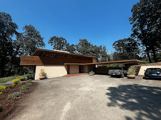 The house was designed by FLlW in the late 50s, shortly before his death. It was built on the banks of the Willamette River in 1963. It was moved here to spare it from the wrecking ball in 2000.