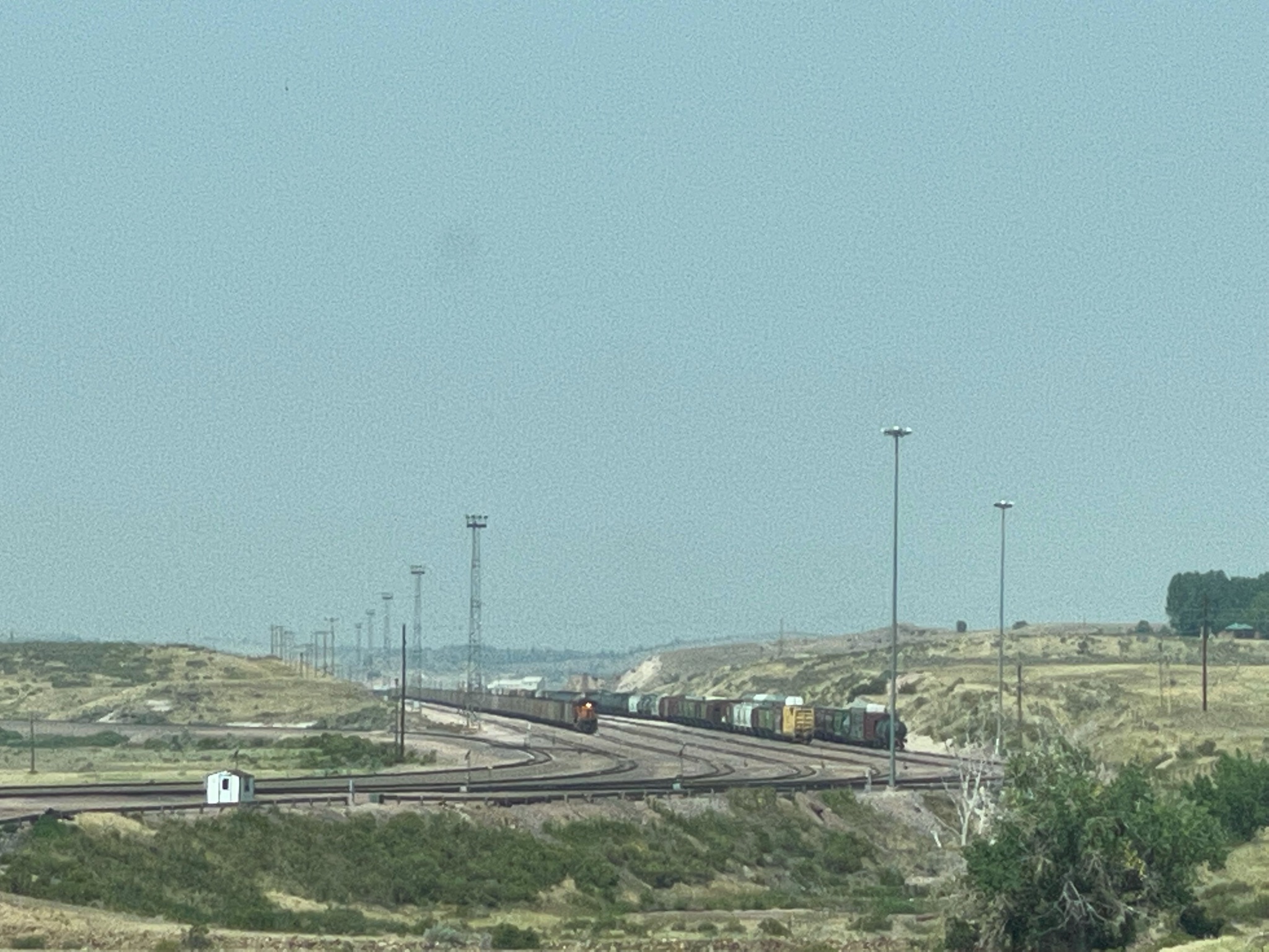 So we hurried on… About ten miles down the road we came to the town of Guernsey, with its giant rail yard. All these train cars are filled with coal, heading into Nebraska to fuel the 15 giant power plants there…