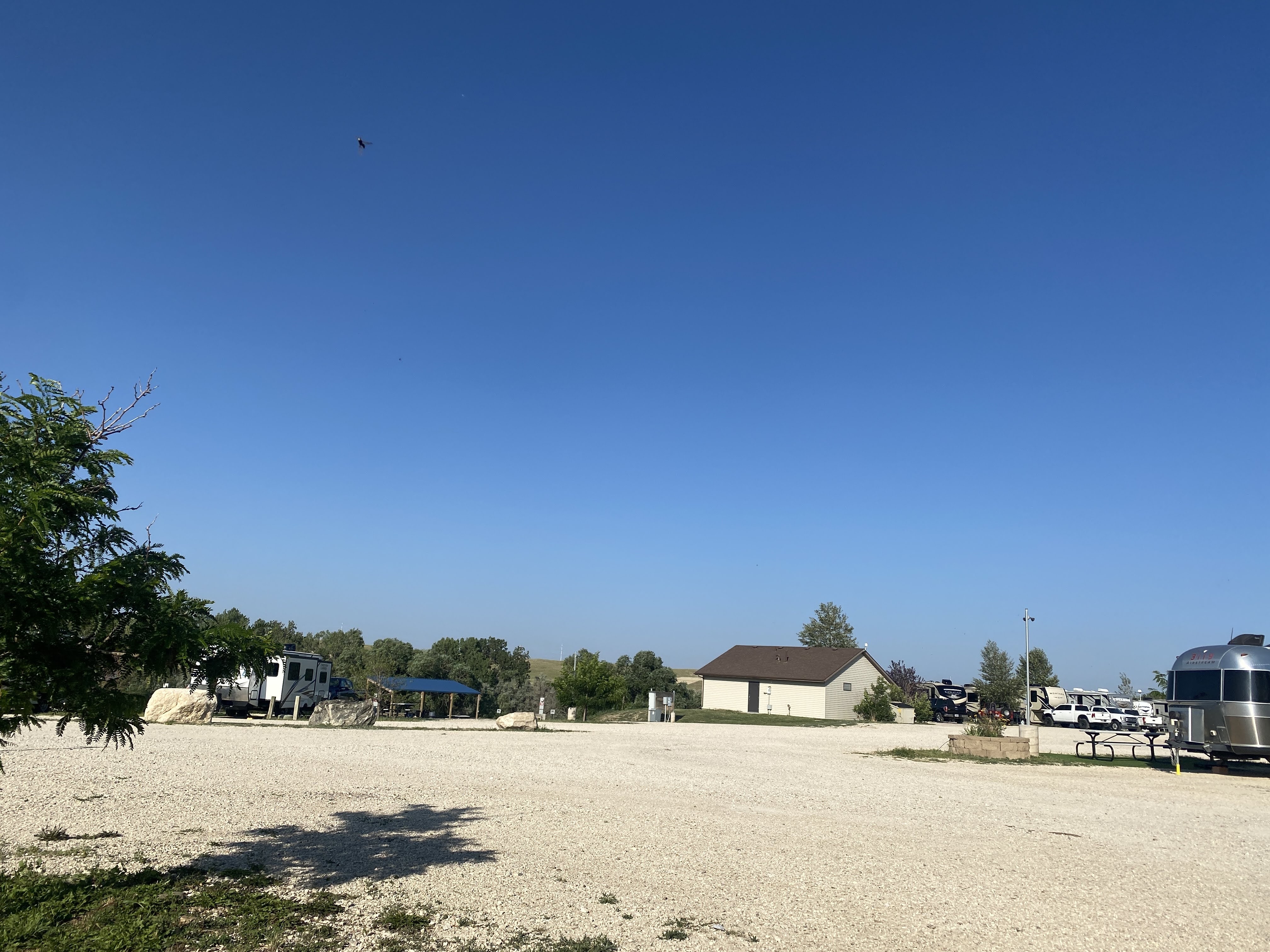 We arrived at our campsite in Evansville, adjacent to Casper… Lots of gravel, and a small patch of plastic grass at each site…